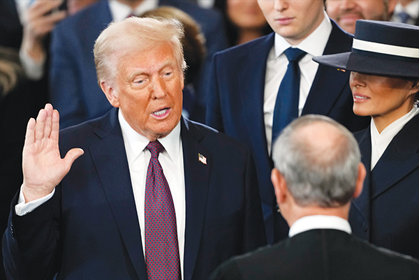 도널드 트럼프 미국 대통령이 1월 20일(현지시간) 수도 워싱턴 DC의 연방의회 의사당 로툰다홀에서 열린 취임식에서 선서하고 제47대 대통령으로서 두 번째 임기를 시작했다. 트럼프 대통령이 부인 멜라니아 여사(오른쪽)와 함께 취임 선서를 하고 있다. 사진=AP/연합뉴스