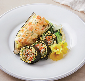 ② 찐 고구마는 우유와 생크림, 무염 버터를 으깨고 고루 섞어 속을 판 가지에 채운 뒤 다진 마늘과 무염 치즈를 올려 180℃로 예열한 오븐에 5분간 굽는다.