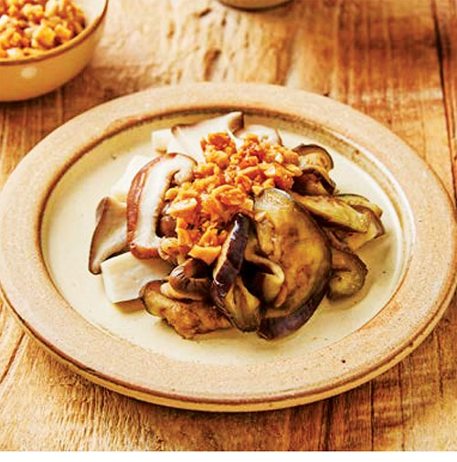 ⑤ 데친 가지와 버섯은 물기를 제거해 그릇에 담고, 땅콩소스를 곁들여 마무리하면 완성!