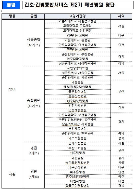 패널병원은 간호·간병통합서비스 사업을 모범적으로 운영하고 있으며 적정한 규모와 시설 수준을 갖춘 우수 의료기관으로 총 상급종합병원 10개소, 종합병원 16개소, 병원 4개소, 통합재활병동 운영기관 6개소가 선정됐다.